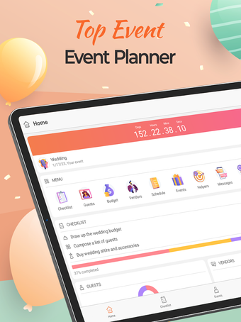 Appen har flera olika avsnitt, som Uppgiftshanteraren, Gästerna, Budgeten och Schemat. Du kan lägga till olika typer av objekt i Uppgiftshanteraren, som en förfallodag, en kategori, en uppgiftsbeskrivning, osv. Gästavsnittet låter dig lägga till en lista över gäster och följeslagare. Budgetavsnittet låter dig specificera en evenemangsbudget. Schemat låter dig skapa ett schema för evenemanget. Appen låter dig också generera utgifter för varje uppgift och den kommer att markera kommande betalningar.